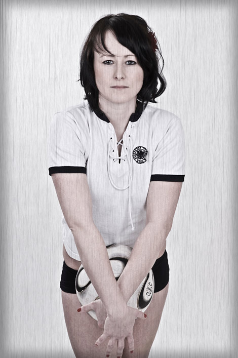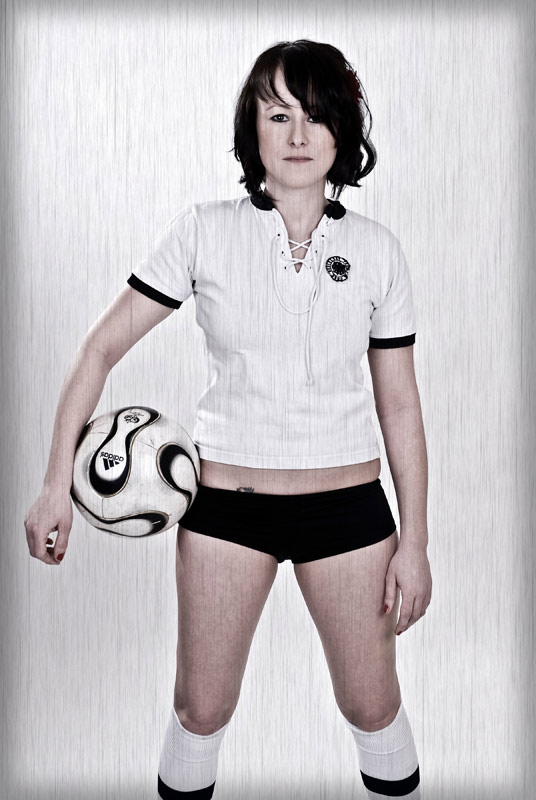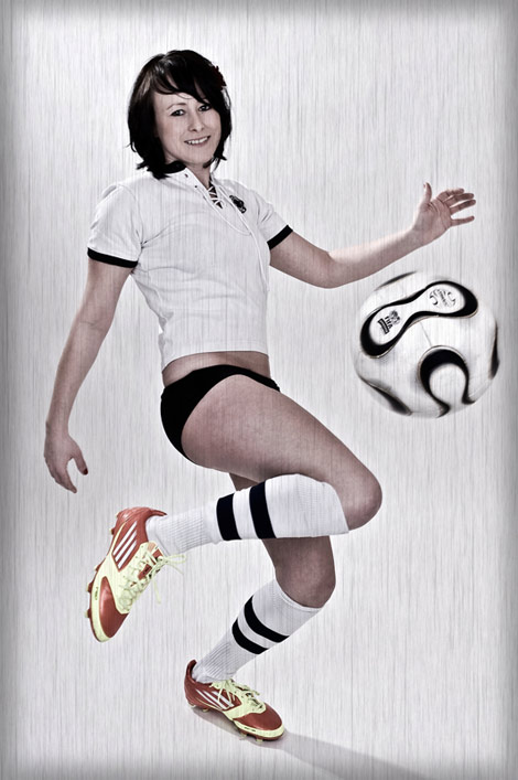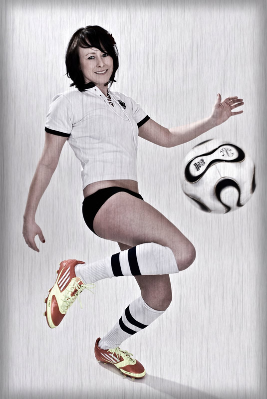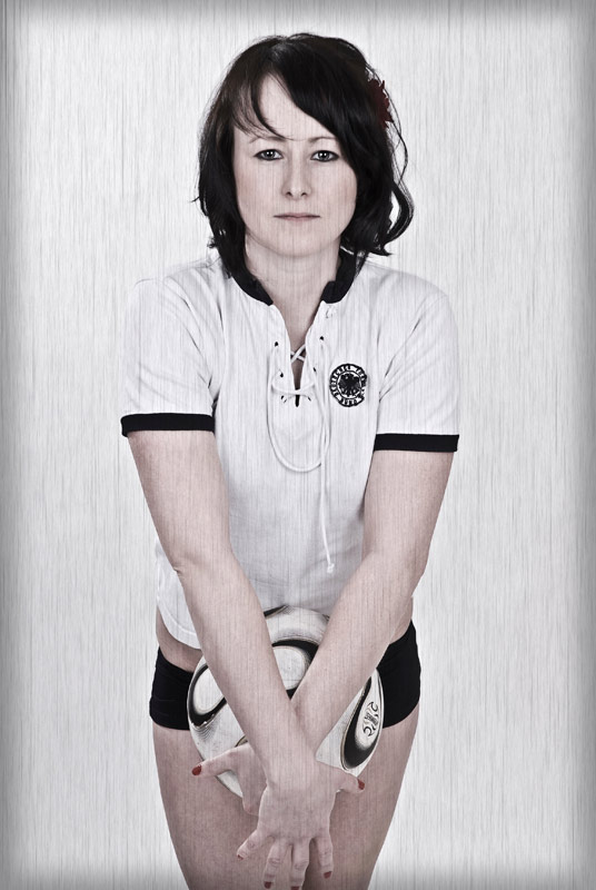 Beim dritten Einsatz des Trikots schlüpfte erstmalig eine bezaubernde Frau in das historische Hemd. Da ihr Freund großer Fussball-Fan ist, wollte sie einige Motive als Fussballspielerin. Der Freund ist Bayern-Fan und M., als HSV-Fan, war froh, dass ich ihr das Deutschlandtrikot raussuchte und ihr so den Auftritt im Bayern-Dress ersparte. Der Trikot-Klassiker, der bei Fans aller Vereine hohes Ansehen geniesst, ist da eine super Alternative. Außerdem dienten diese Bilder auch als guter Einstieg in das Fotoshooting. Bälle flogen knapp am Blitzlicht vorbei und wurden elegant verarbeitet.