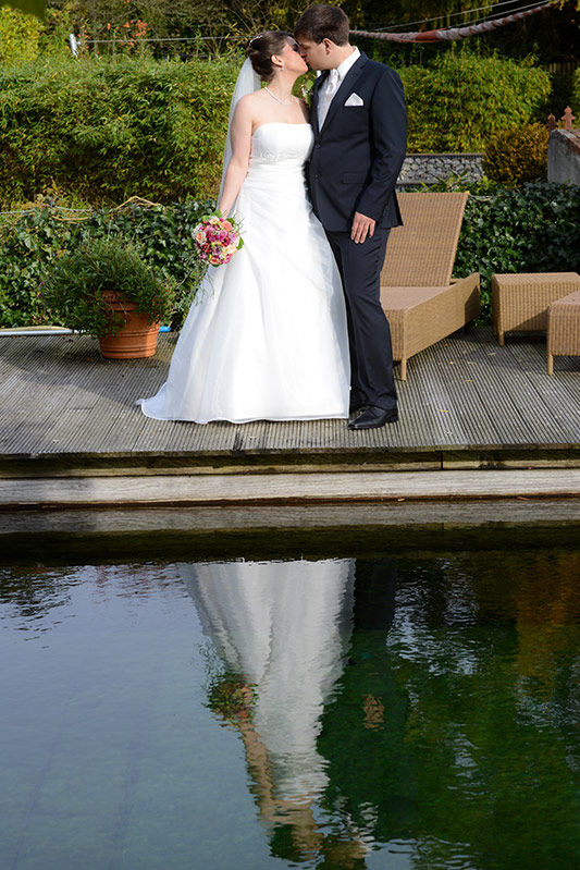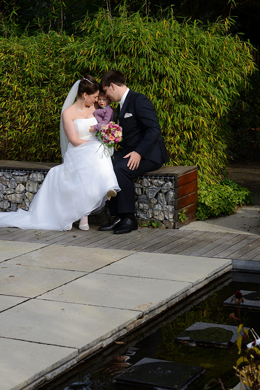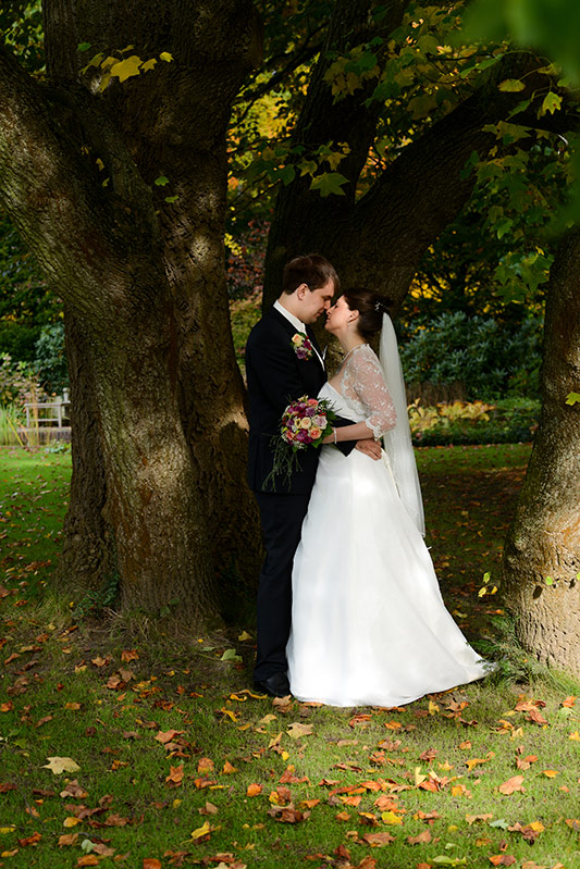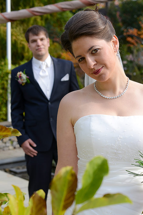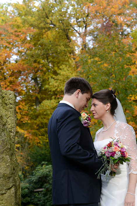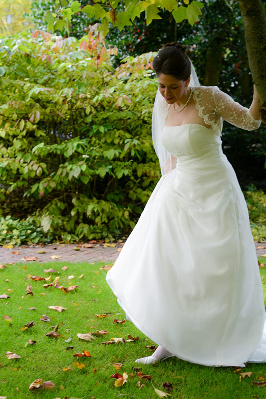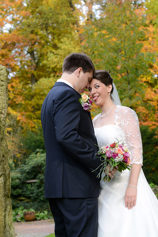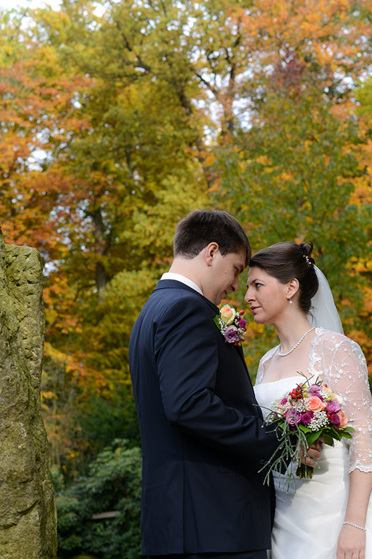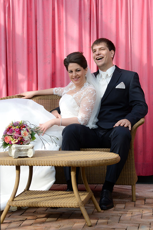 Es ist Ende Oktober schon sehr kühl, aber wenn die Sonne lacht, spürt man noch ihre schwindende Kraft. Ein goldener Oktobertag in einem schönen Garten. Was will man mehr. Überall findet man schöne und gemütliche Ecken. Das Brautpaar genießt die letzten Momente bevor der Trubel losgeht. Nach den Aufnahmen wird endlich geheiratet!