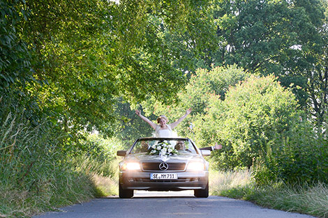 Der Sommer 2014 machte aus Norddeutschland lange Zeit ein Backofen. Wohl dem, der ein Cabrio hat. Der leicht kühlende Fahrtwind war die einzige Möglichkeit der Hitze für wenige Augenblicke zu entfliehen. So bot es sich an, dass Cabrio für die Brautpaaraufnahmen so oft wie möglich einzusetzen. Dem Bräutigam wird es recht gewesen sein. Was gibt es schöneres als seine Liebste mit dem Cabrio durch den sonnigen Tag zu chauffieren ...