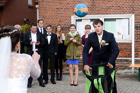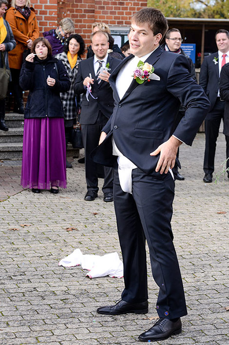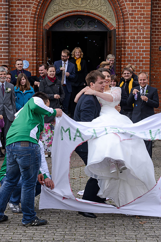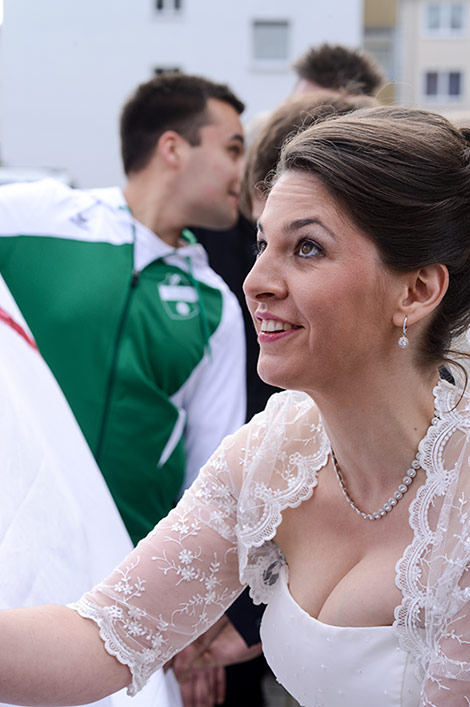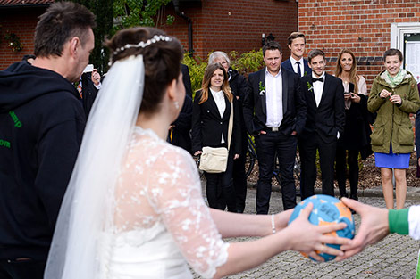 Temperament kann man diesem Brautpaar mit Sicherheit nicht absprechen. Auch während der Trauung blitzt es immer wieder auf, diese Feuer! Am Ende der Trauung muss nicht nur das obligatorische Herz aus einem Laken geschnitten werden, sondern es wartet auch noch eine leicht pikante Handballprüfung auf die Beiden! Aber die Beiden sind ja Profis!