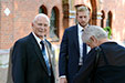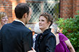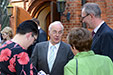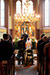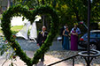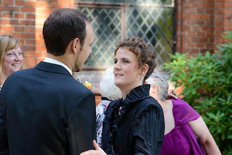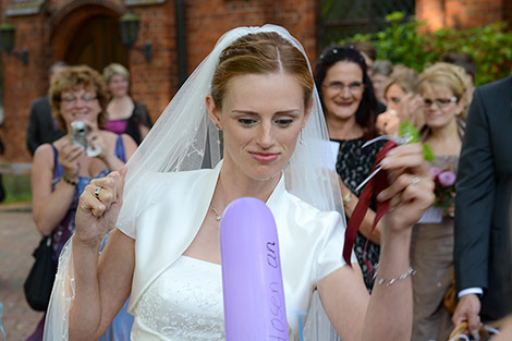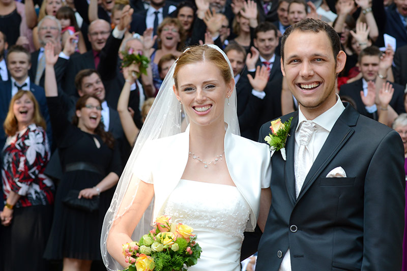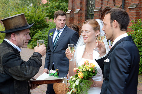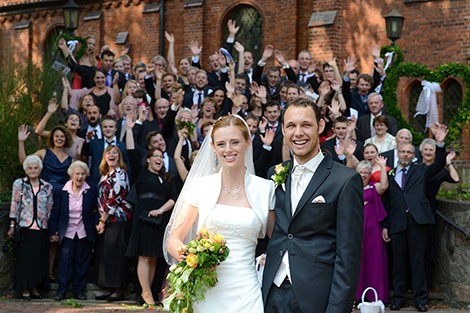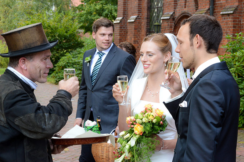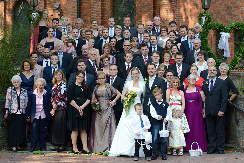 Nicht nur die Sonne strahl, sondern auch das Brautpaar strahlt. Fast schon ein Wettkampf. Nach der Trauung wurde das Paar von einem musikalischen Schornsteinfeger begrüßt. Da kann wohl nichts schiefgehen. Und am Ende des Auszuges strahlten dann auch noch alle Gäste für ein schönes freundliches Gruppenfoto. Wohl dem, der stimmungsvolle Gäste hat.