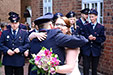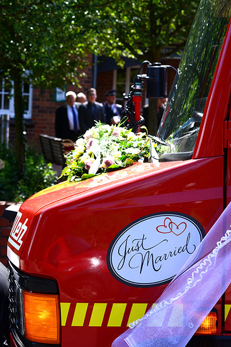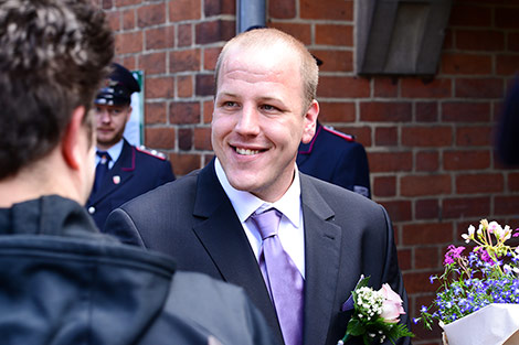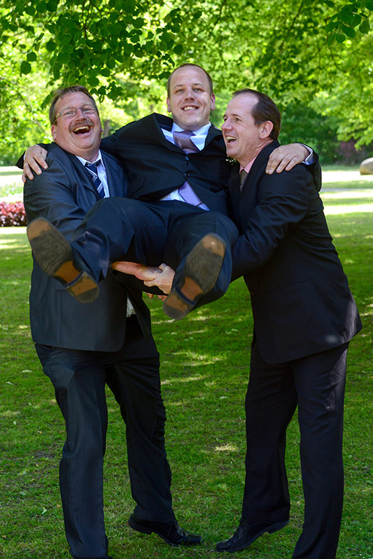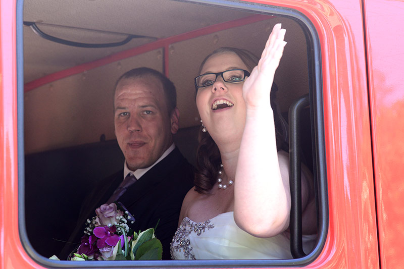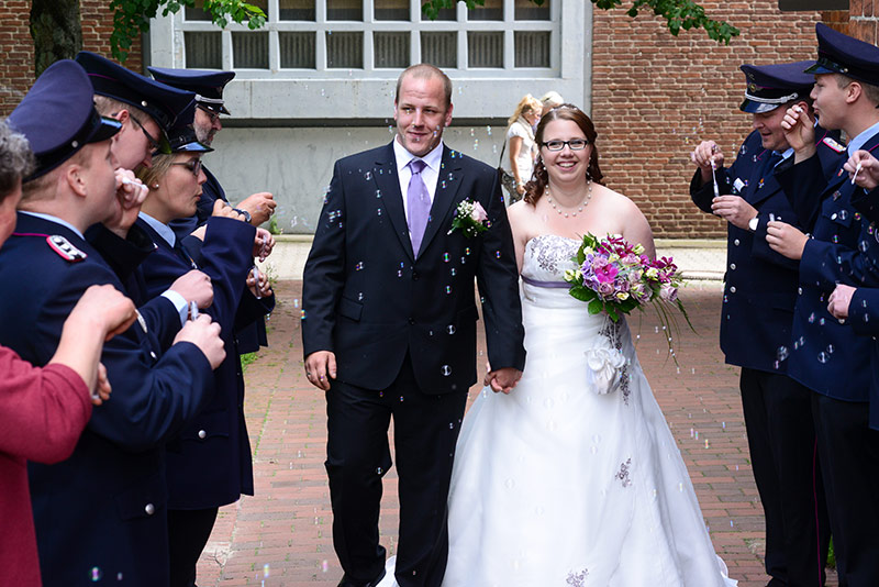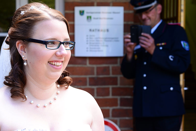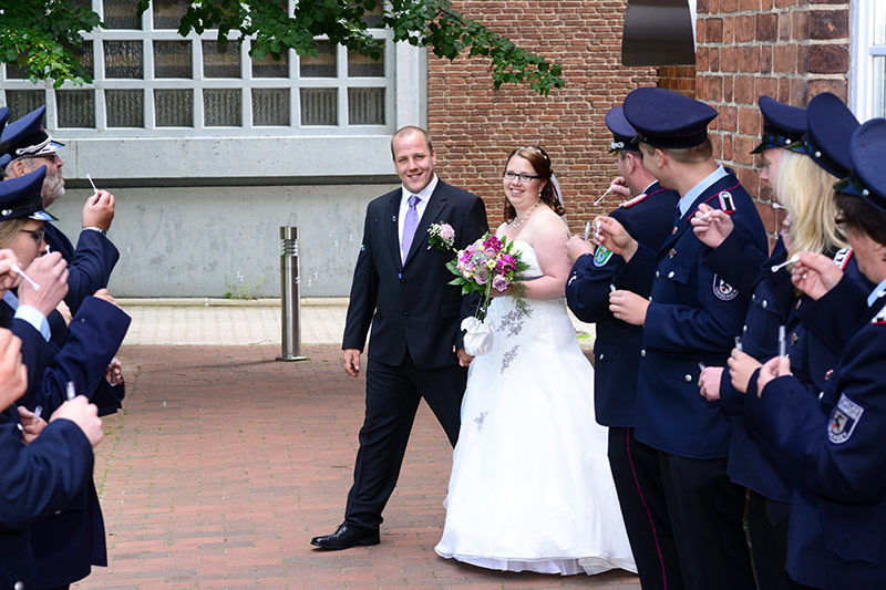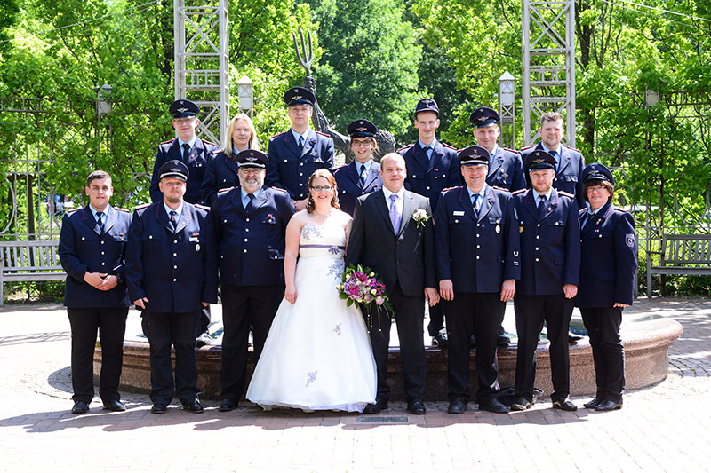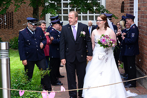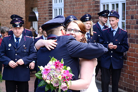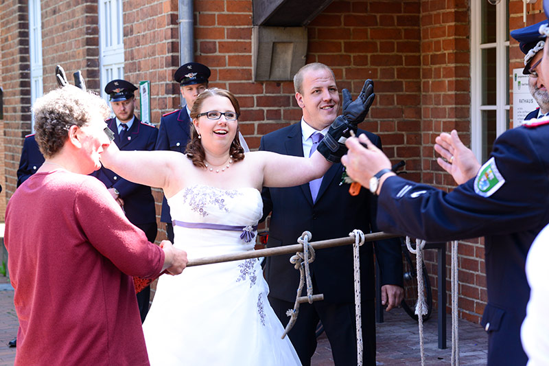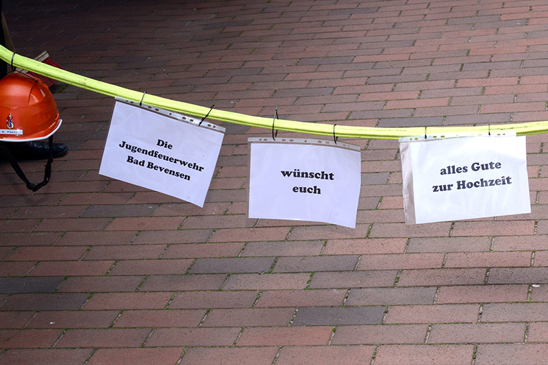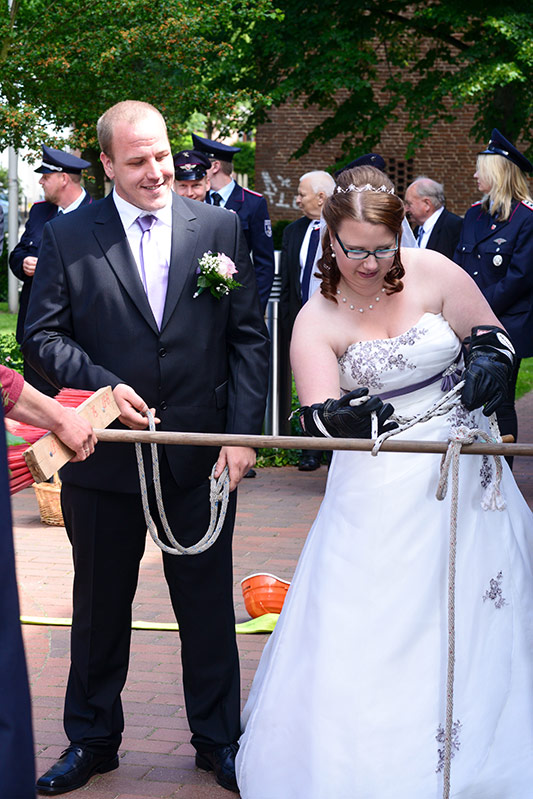 „Gut Wehr!“ Auf allen Versammlungen von Feuerwehren ein laut vorgetragener Ausruf. Aber die Kameraden können auch ganz anders. Feierlich, fast schon andächtig! Es wird geheiratet! Natürlich sind die Kameraden dabei! Verlässlich! Sie stehen Spalier und zollen dem Paar Respekt. Sie haben auch knifflige Aufgaben für das Brautpaar vorbereitet. Ganz schön schweißtreibend in der Junihitze zur Mittagszeit!