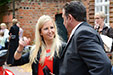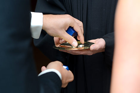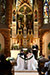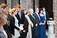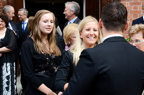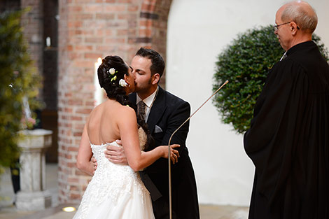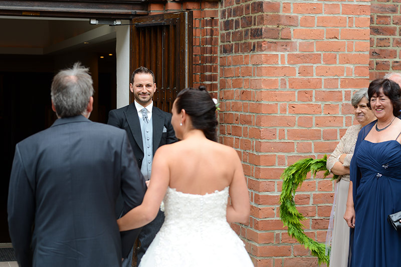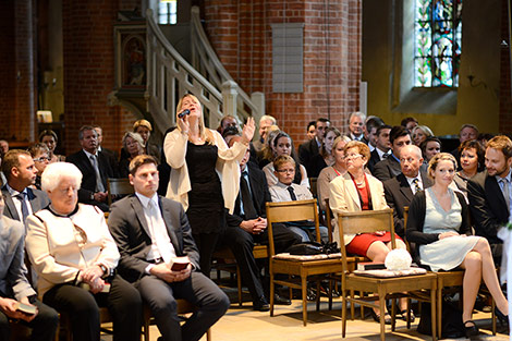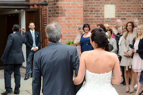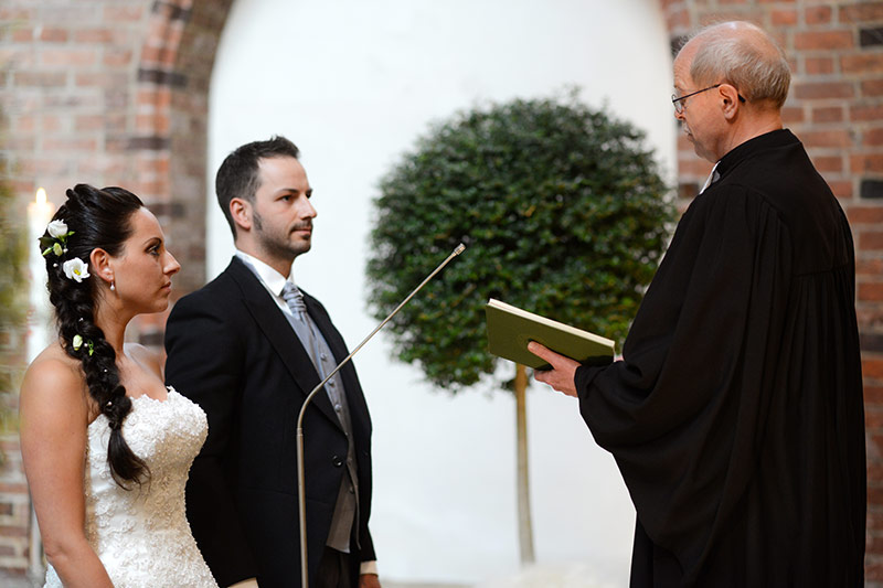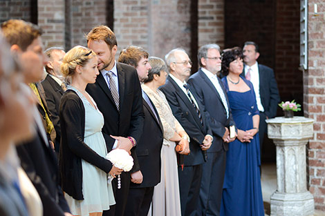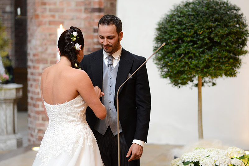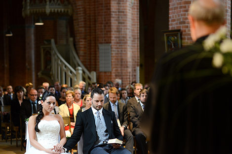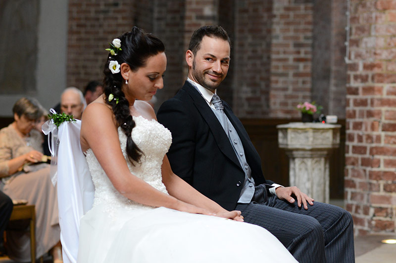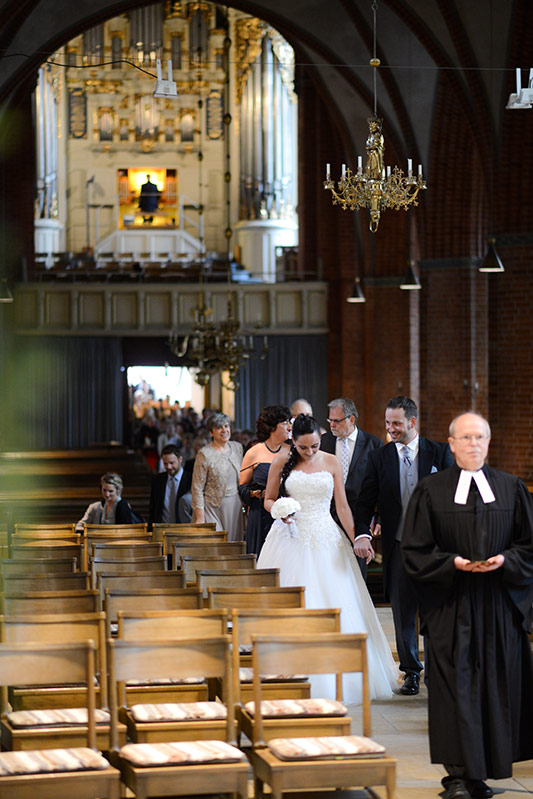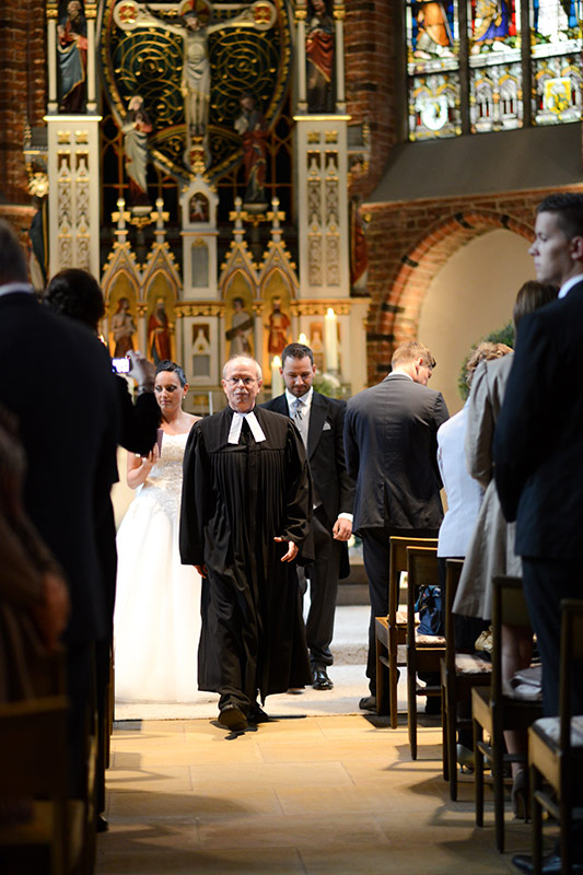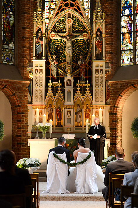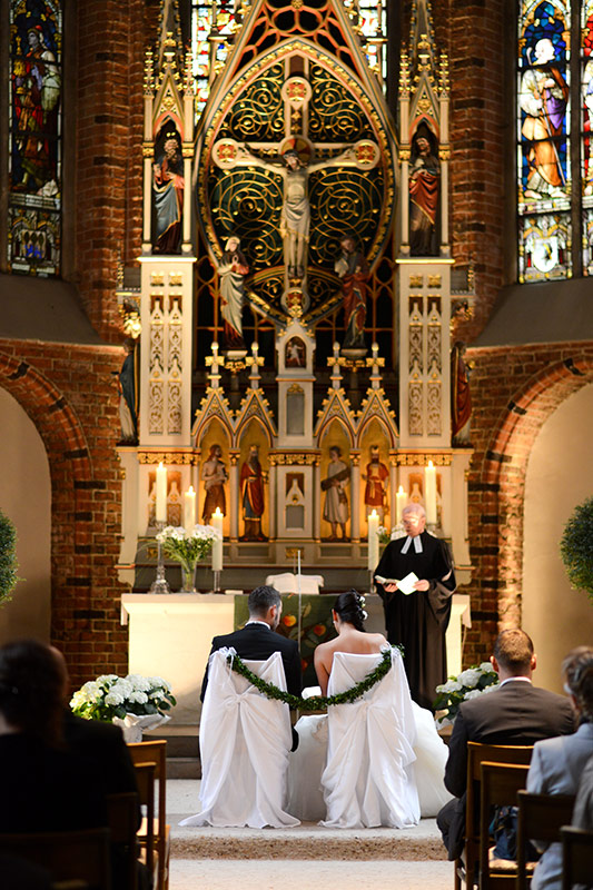 Eine wunderschöne große Kirche füllt sich und trägt eine feierliche Stimmung hinein. Angeführt vom Brautpaar schreitet die Gesellschaft in die schützenden Mauern der Kirche. Die Reihen füllen sich schnell. Nun kann die Trauung beginnen. Als die Sängerin den Raum mit Ihrer Stimme füllte, hörten ihr alle gebannt zu. Eine große Hochzeit in einem angemessenen Rahmen.