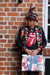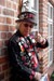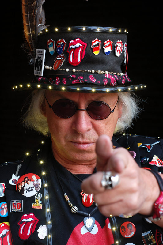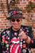 Unzählige Pins und Sticker, ja auch Puppenköpfe schmücken seinen Hut und seinen Frack. Damit nicht genug, denn Leuchtdioden an Hut, Frack und Hose sorgen für das überraschende Highlight seines Outfits!